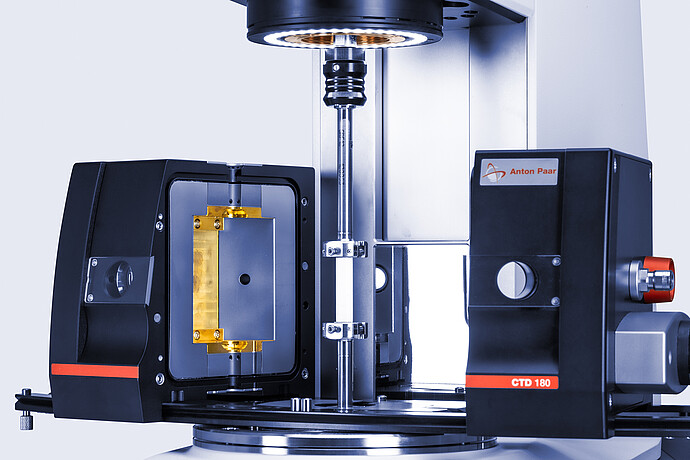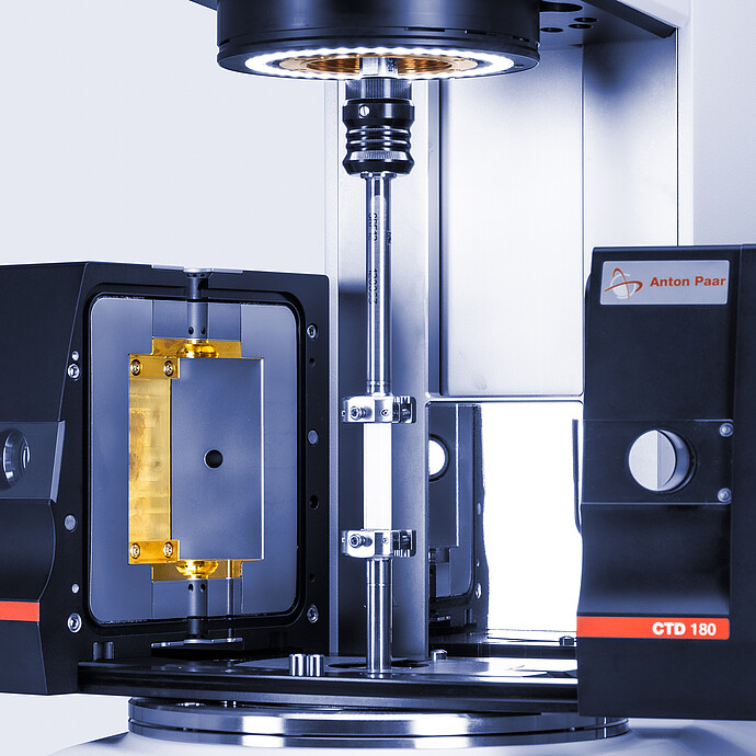 对于压缩模式 DMA 分析,可以将平行板测量系统与 MCR 配置相结合,并采用线性马达。这些系统适用于泡沫、弹性体、食品系统和凝胶的 DMA 分析。由于无需对材料进行夹紧,因此其在样品尺寸选择上具备灵活性。该系统还可搭配 MCR 的旋转马达进行流变表征,同时也能用于测量热膨胀。
